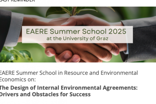 The 2025 EAERE Summer School will address "The Design of Internal Environmental Agreements: Drivers and Obstacles for Success" and will take place from 7 to 13 June 2025 in Castle Seggau, close to Graz, Styria, Austria.