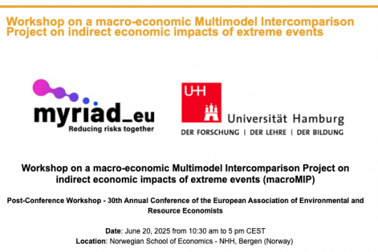 The MYRIAD-EU project and the research group climate extremes are pleased to announce a workshop on a macro-economic Multimodel Intercomparison Project on indirect economic impacts of extreme events (macroMIP), scheduled to take place on June 20, 2025 at the Norwegian School of Economics - NHH in Bergen (Norway). The workshop will be staged directly following the EAERE 30th Annual Conference.
