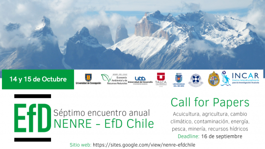 The Seventh Annual Meeting of the EfD Chile center "Research Nucleus on Environmental and Natural Resource Economics (NENRE)", will take place on October 14-15 (time to be defined). The Call for Paper has deadline for September 16, and is focused on the following topics: