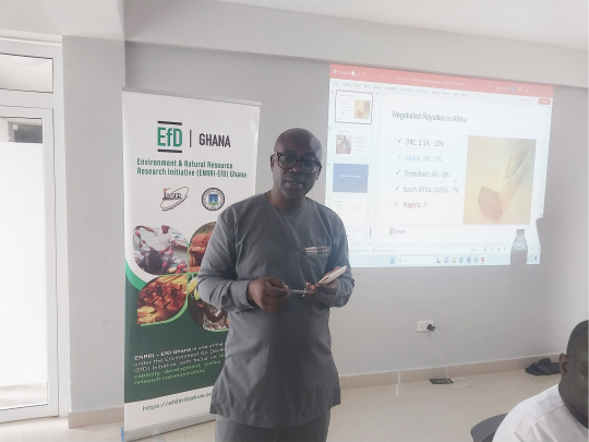 The workshop commenced with a presentation on EfD Ghana followed by an interactive session followed, where researchers facilitated discussions on pertinent themes. Here, Dr. Kwami Adanu facilitates the session on mining and energy.