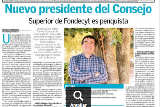 Senior EfD Research Fellow and Center Director of NENRE-Concepción, Carlos Chávez, was interviewed in relation to his new responsibilities as President of the Higher Council of the National Fund for Scientific and Technological Development (FONDECYT) in Chile.