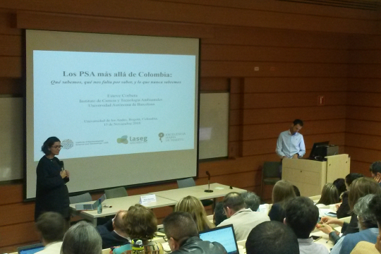 On Thursday November 15th 2018, EfD Colombia organized together with EfD Senior Researcher María Alejandra Velez and Lina Moros (PhD candidate, ICTA- Universidad Autónoma de Barcelona) the policy day at Universidad de Los Andes in Bogota with the title: “Payments for Environmental Services in Colombia: discourses, design, implementation and challenges”, in which Prof. Corbera was keynote speaker and presented a comprehensive review of the state of the Payment for Environmental Services (PES). In this policy day, María Alejandra Velez, Lina Moros, representatives from the national and local government agencies, practitioners from non-governmental institutions participated with presentations about the challenges, visions, discourses and practice of PES in Colombia. The policy day brought together over 80 people from across the country including government officers, NGO members and other practitioners, as well as academics involved in PES discussion and implementation.