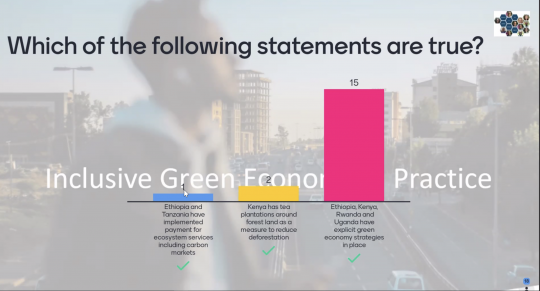 About 40 people in all attended the meeting. Even though it was online, it was very interactive and with a lot of contributions from the participants. There was a presentation of the program and all the participants. There were also group discussions in break-out rooms as well as a survey and a quiz where the participants competed in teams on the topic of Inclusive Green Economy.